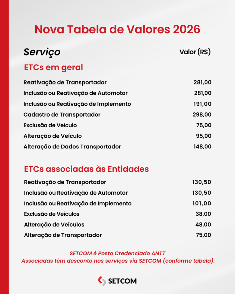 O SETCOM comunica às empresas associadas que a Agência Nacional de Transportes Terrestres (ANTT) promoveu alterações nos valores de seus serviços. Os novos valores entrarão em vigência a partir de 01/02/2026.