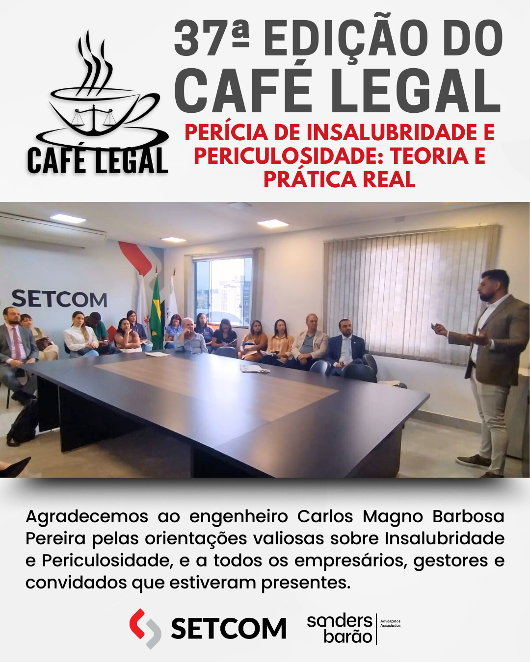 📢 37º Café Legal – Perícia de Insalubridade e Periculosidade: teoria e prática real 📅 23/09 (terça-feira) – 🕗 08h 📍 Sede do SETCOM 👨🏫 Palestrante: Carlos Magno Barbosa...