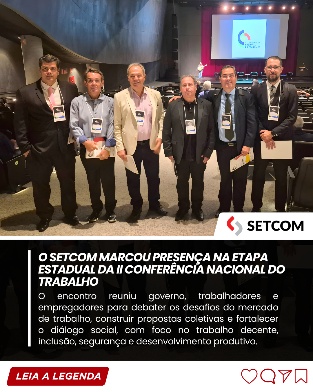 O SETCOM, representado pelo presidente Osvaldo Donizeti, participou nesta terça‑feira (18) da etapa estadual da II Conferência Nacional do Trabalho (II CNT), realizada no Auditório do SESC Palladium, em...