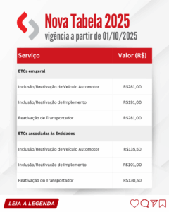 A partir do dia 01 de outubro de 2025 (quarta-feira), entra em vigor a nova tabela de valores dos serviços do RNTRC (Registro Nacional de Transportadores Rodoviários de Cargas). A atualização foi definida pela CNT e estabelecida pelas Federações representativas da categoria das Empresas de Transporte de Cargas (ETC).