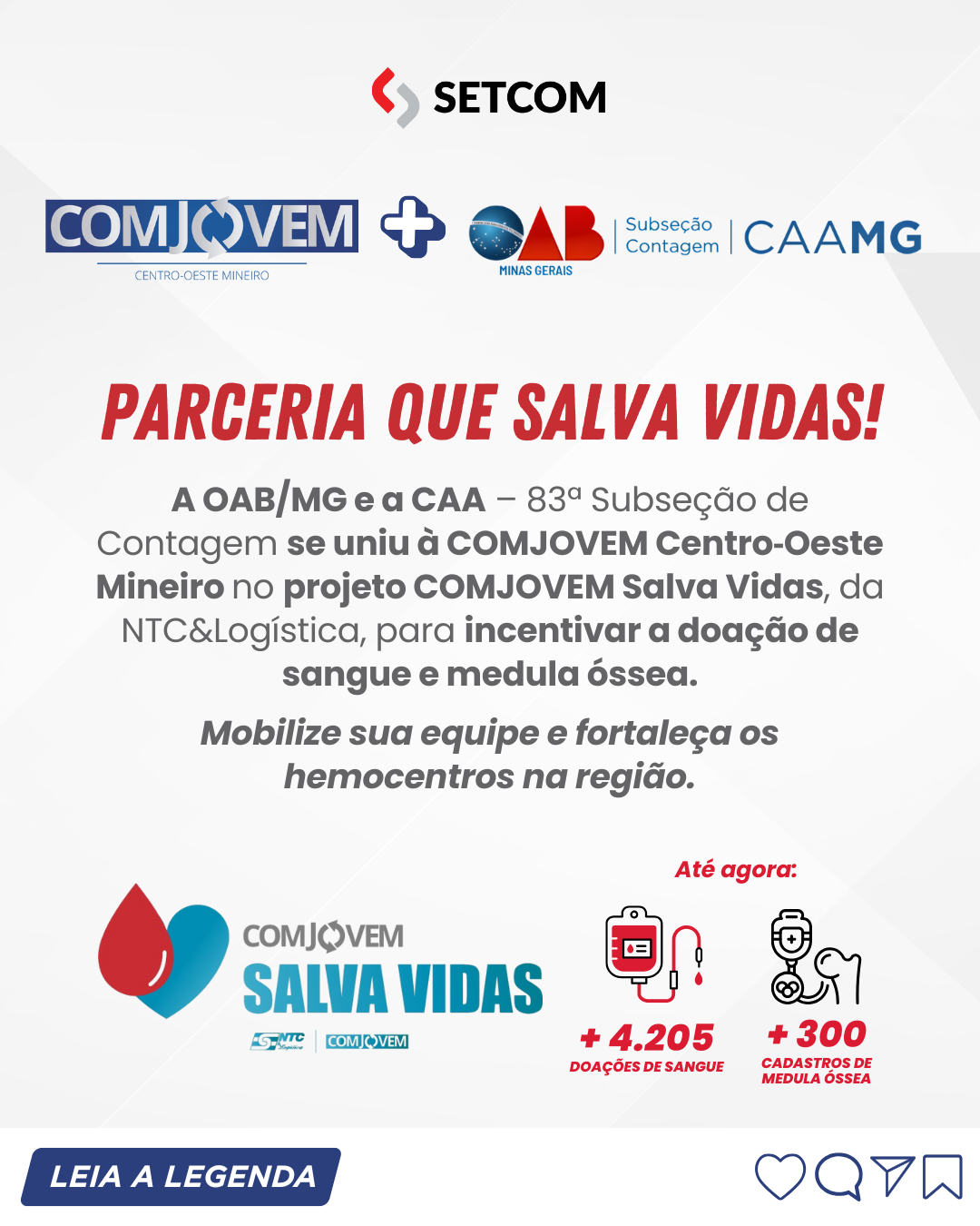 A OAB/MG e a CAA – 83ª Subseção de Contagem se uniram à COMJOVEM Centro‑Oeste Mineiro no projeto COMJOVEM Salva Vidas, iniciativa da NTC&Logística e da COMJOVEM que, desde 2017, já contabiliza +4.205 doações de sangue e +300 cadastros de medula óssea. No Junho Vermelho o movimento ganha força, mas a doação é necessária o ano todo.