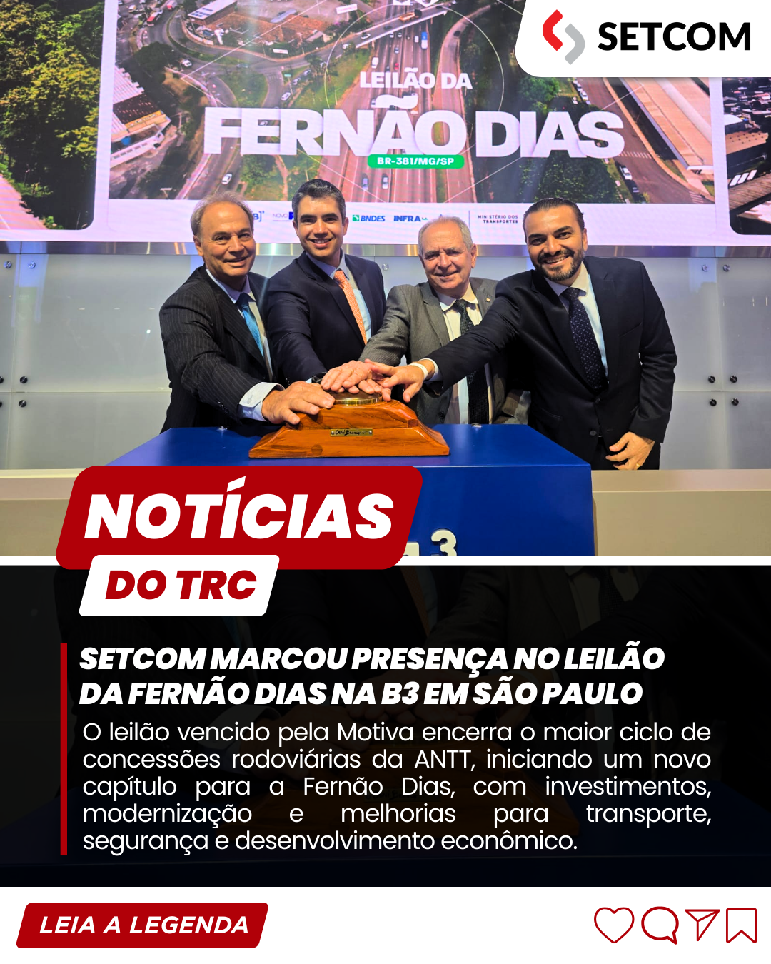 O SETCOM marcou presença no leilão da BR‑381/MG/SP – Fernão Dias, realizado nesta quinta-feira (11/12) na B3, em São Paulo. Representado pelo presidente Osvaldo Donizeti, pelo vice-presidente Rogério Rigueira e pelo acessor jurídico Dr. Sanders Barão, o sindicato reforçou seu compromisso institucional com temas que impactam diretamente o transporte rodoviário de cargas e o desenvolvimento logístico de Minas Gerais.
